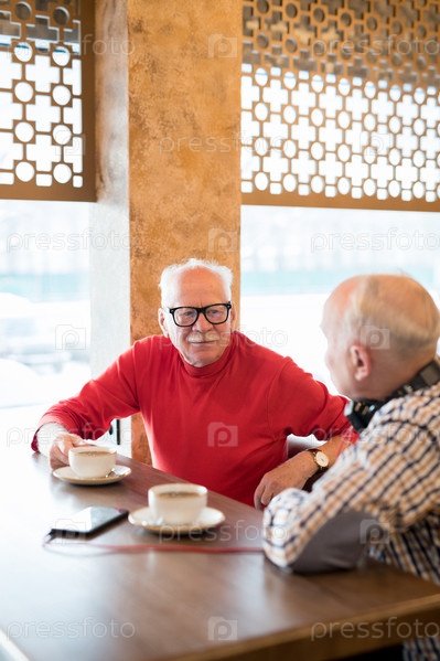 Любопытный старший мужчина разговаривает с другом в кафе