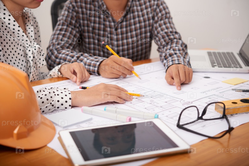 Коллеги по сельскому хозяйству указывают на чертеж в офисе