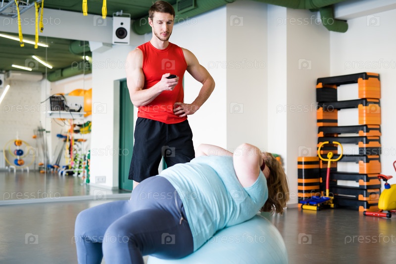 Женщина с ожирением тренируется в фитнес-клубе