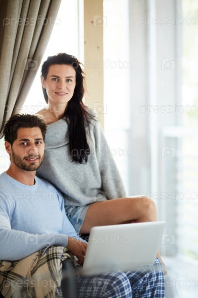 Улыбающаяся пара отдыхает с ноутбуком дома