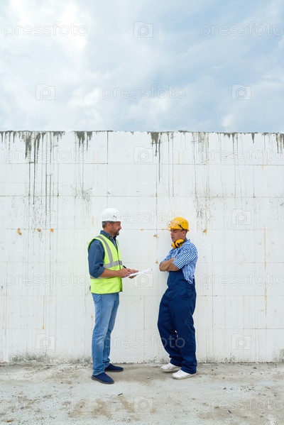 Два строительных работника обсуждают стройку