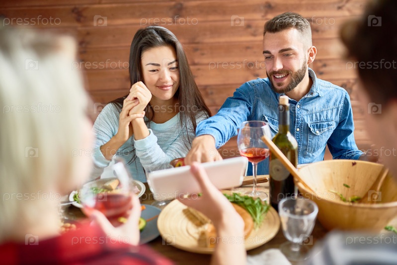 Молодая пара смотрит на фотографии со смартфона