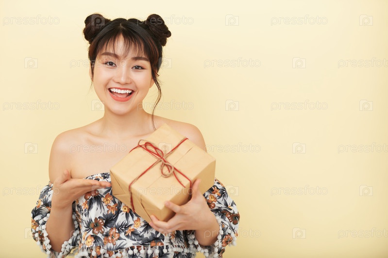 Яркая этническая женщина, показывающая подарочный ящик