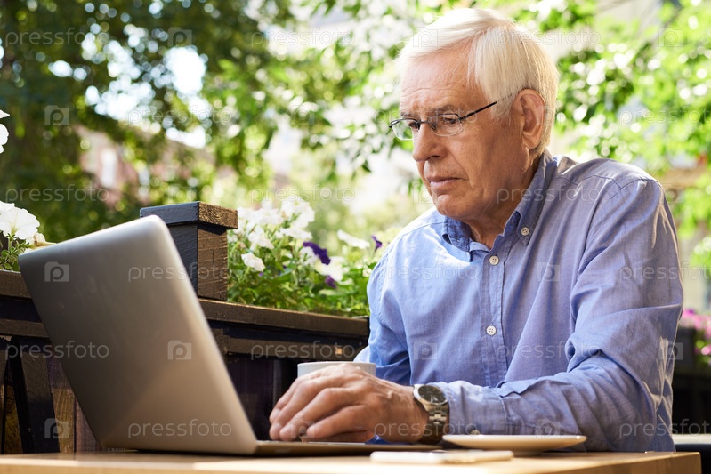 Пожилой мужчина использует ноутбук в современном кафе