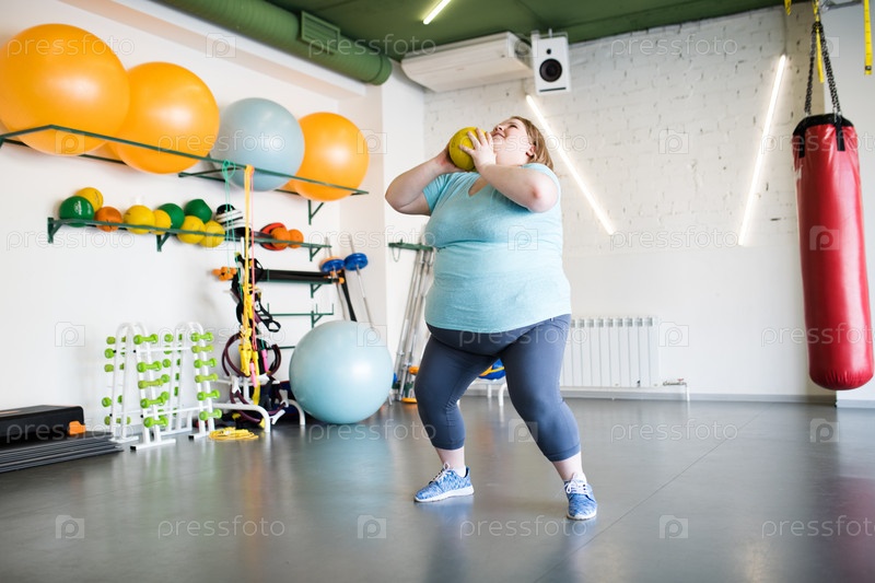 Женщина с избыточным весом делает приседания