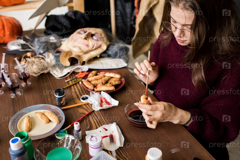 Концентрированная женщина добавляет пищевой цвет для печенья с колдовскими пальцами