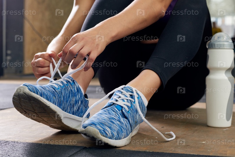Женщина, завязывающая спортивные туфли в тренажерном зале
