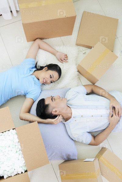 Романтическая пара среди ящиков на полу