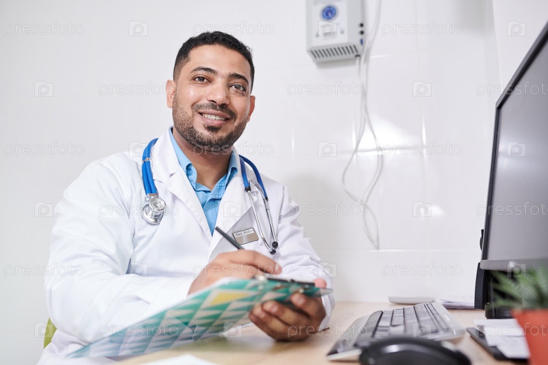 Ближневосточный врач позирует за столом