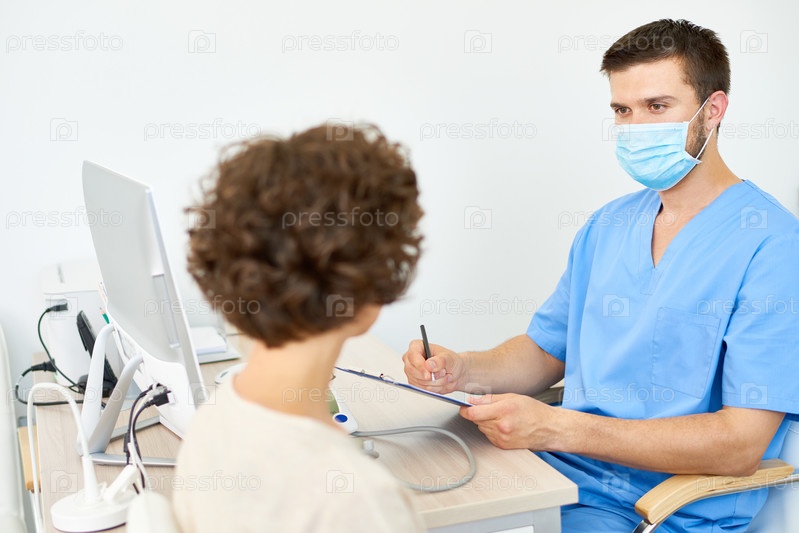 Молодой врач разговаривает с пациентом в кабинете