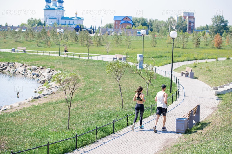 Пара бегает в парке под высоким углом
