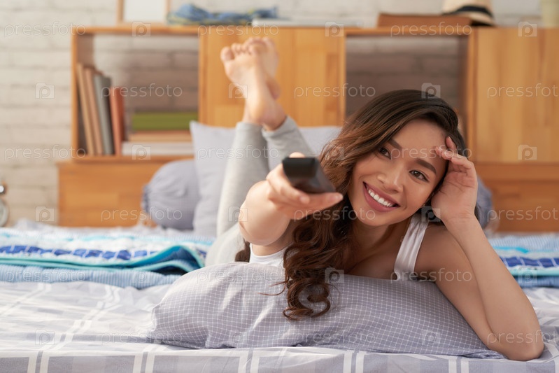 Улыбающаяся женщина смотрит телевизор