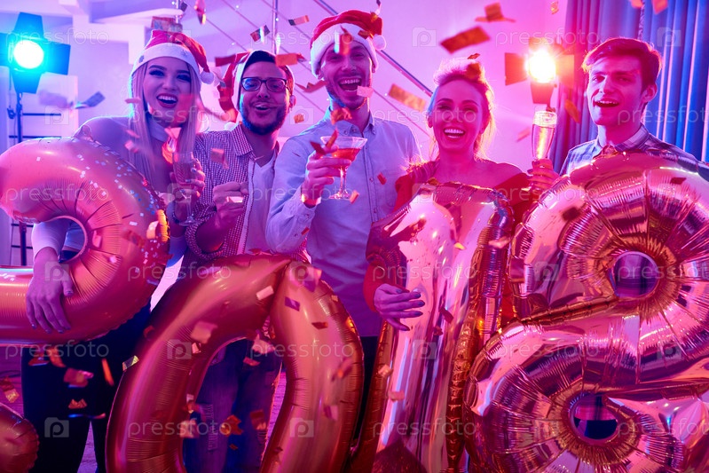 Смеющиеся друзья с золотыми воздушными шарами 2018 года