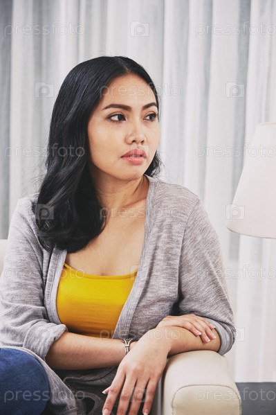 Вдумчивая филиппинская женщина сидит на диване