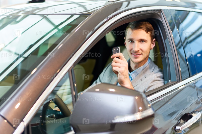 Счастливый человек внутри новой машины