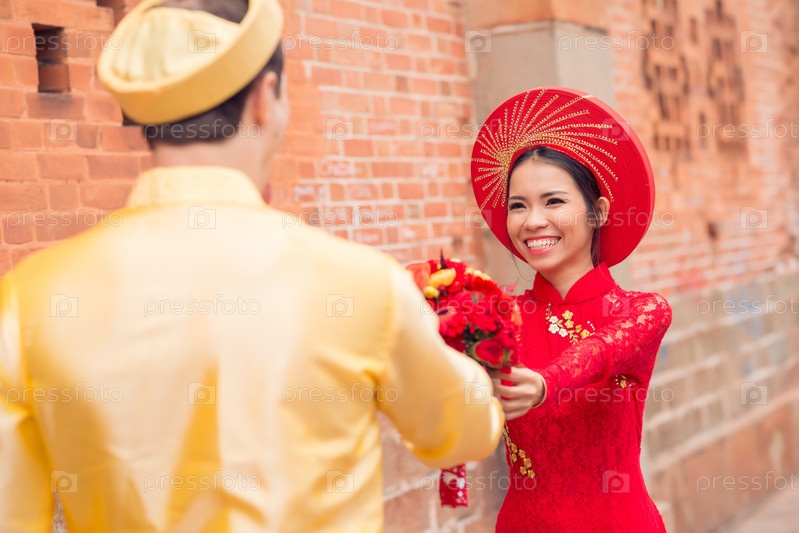 Веселые молодожены в традиционных вьетнамских костюмах