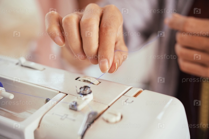 Рыбные руки кладут нить в швейную машину