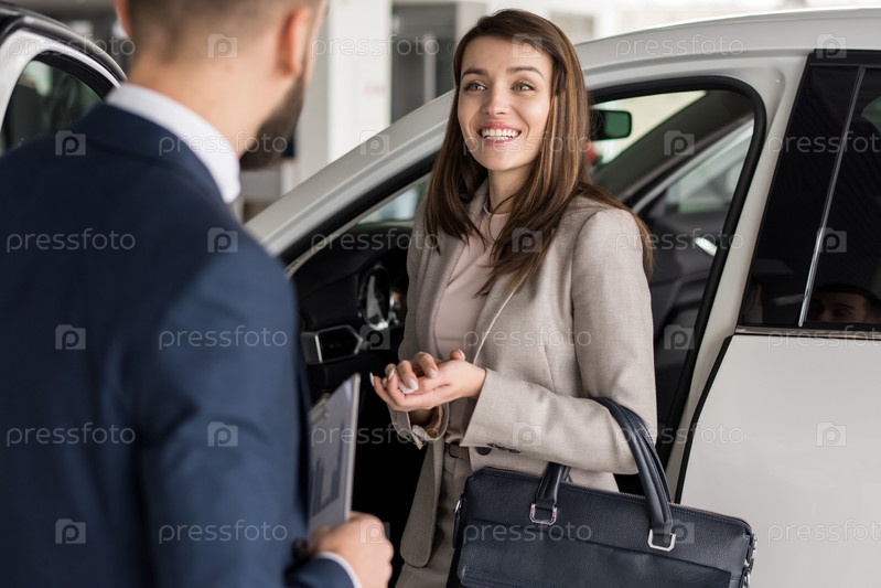 Счастливая женщина, выбирающая автомобиль в салоне