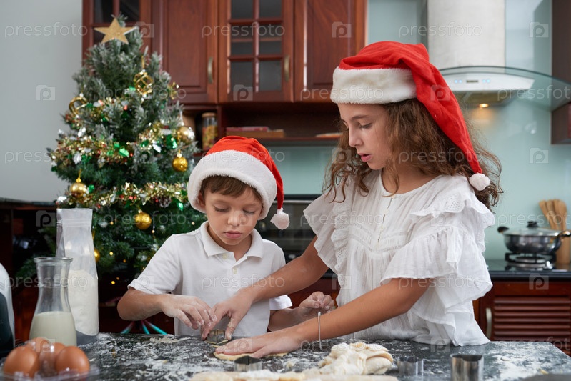 Братья и сестры режут тесто для печенья
