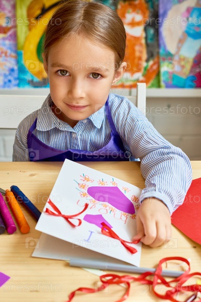 Милая девочка делает ручной карточку для мамы