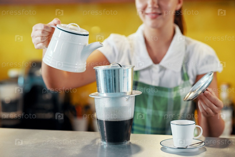 Crop barista заваривает кофе, наливая горячую воду