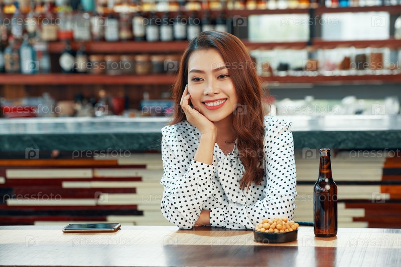 Красивая улыбающаяся женщина отдыхает в баре