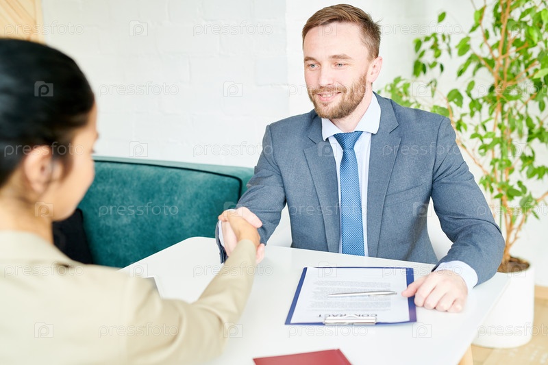 Красивый бизнесмен пожимает руку партнеру за столом заседаний