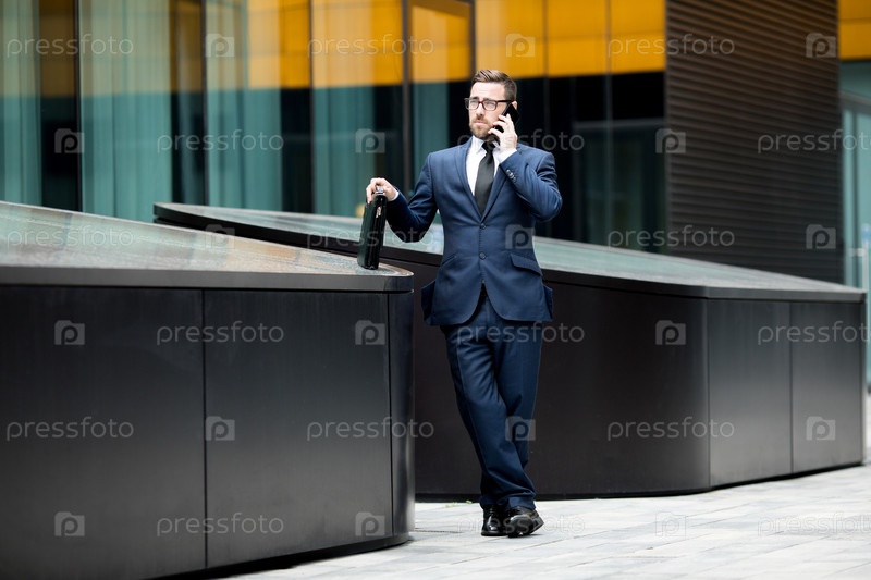 Бизнесмен разговаривает со смартфоном возле офисного здания