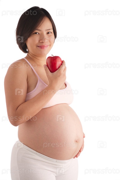 Беременная женщина с красным яблоком счастлива