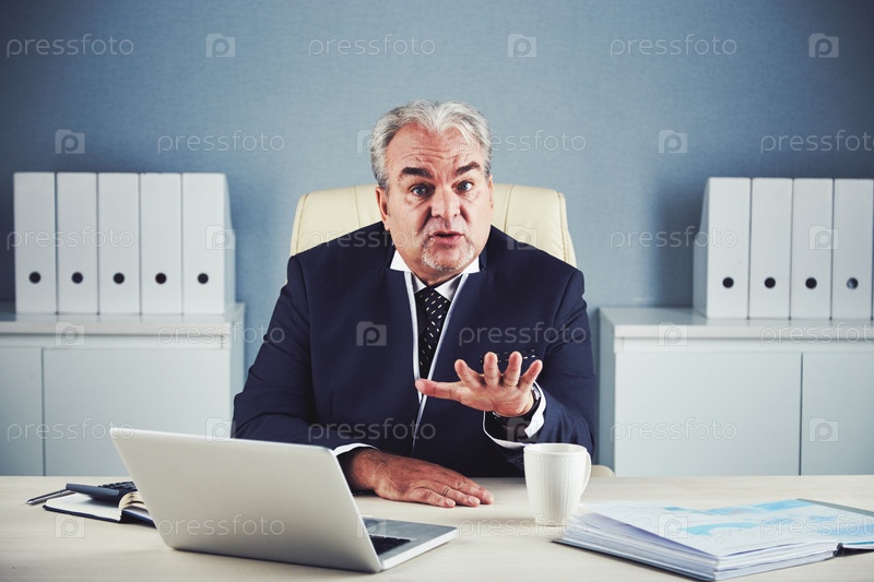 Эмоционально зрелый бизнесмен показывает успокаивающий жест