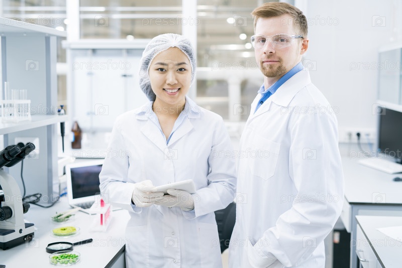 Улыбающиеся микробиологи, стоящие в лаборатории с планшетом