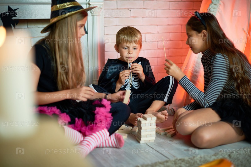 Дети играют в игры на вечеринке Хэллоуина