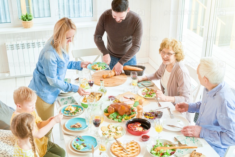 Счастливая семья за ужином в солнечном свете