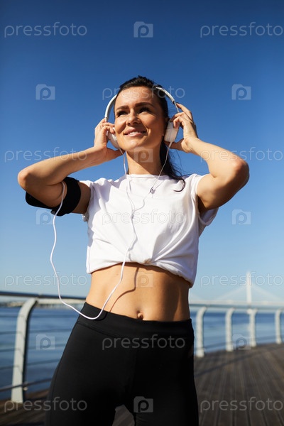 Счастливая женщина в наушниках готовится к тренировкам на свежем воздухе