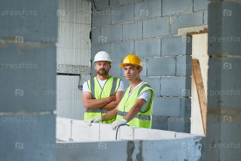 Строительные рабочие позируют на площадке