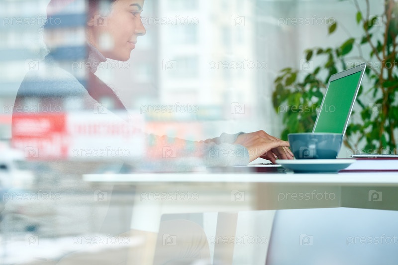 Красивая женщина работает за стеклянной стеной