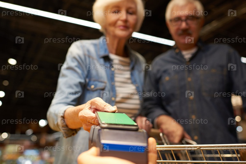 Старшая пара платит со смартфонами