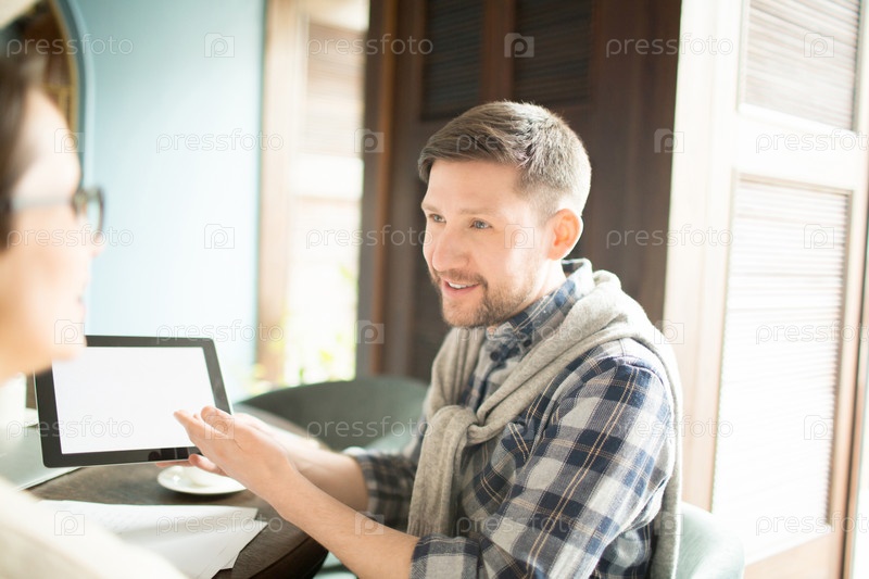Мужчина показывает планшет коллеге
