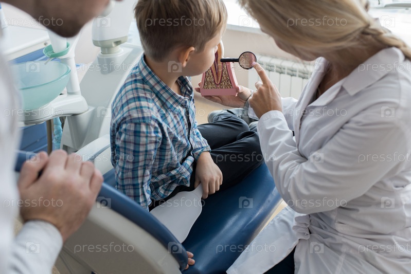 Стоматолог объясняет структуру зубов ребенку