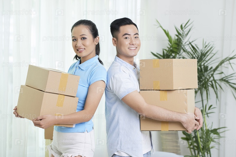 Улыбающаяся этническая пара с картонными коробками