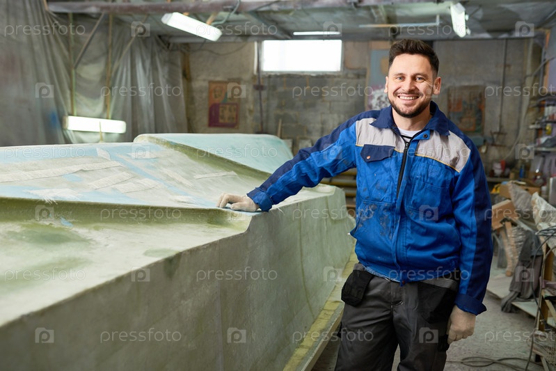 Улыбающийся ремонтник лодки позирует в мастерской