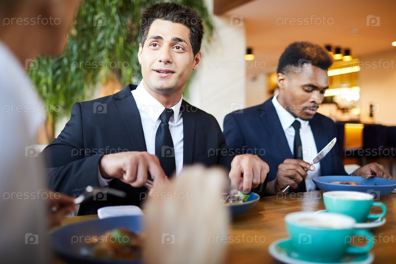 Позитивный бизнесмен беседует с коллегами за ужином