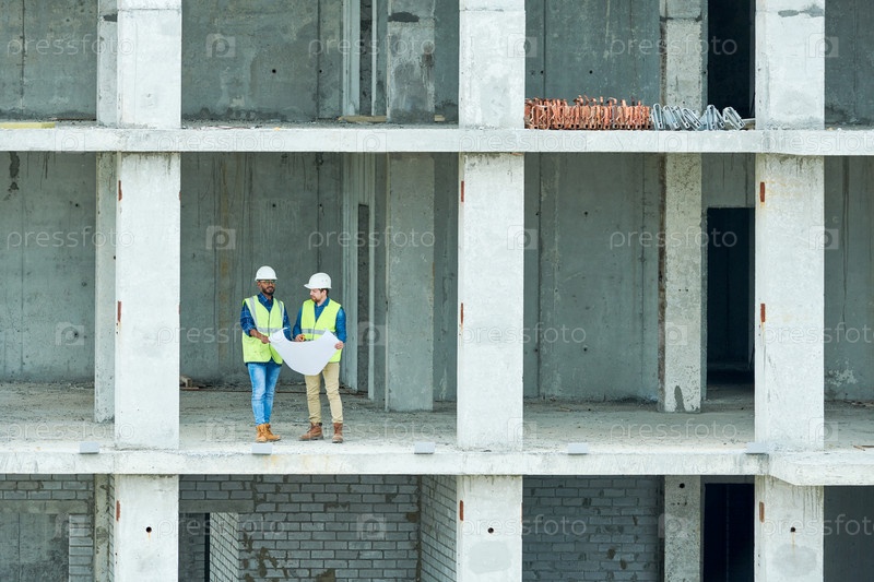 Строительные инженеры читают черновик в незавершенном здании