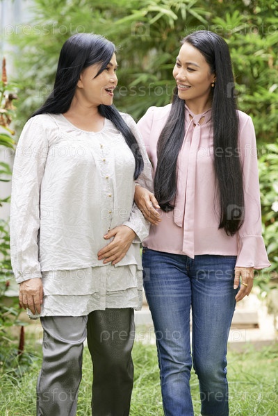 Любящие взрослые и зрелые женщины, гуляющие в парке
