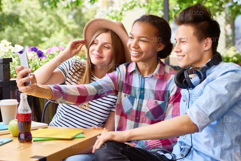 Веселые студенты делают селфи в кафе