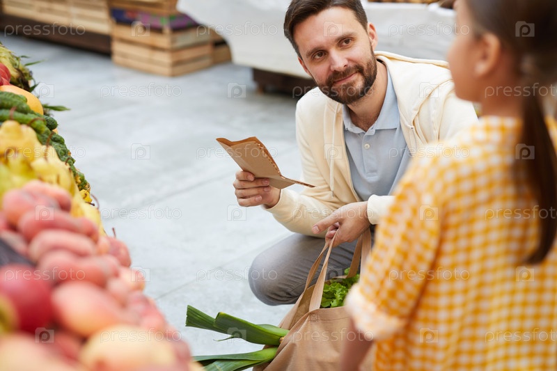 Отец слушает дочь, покупая органическую пищу