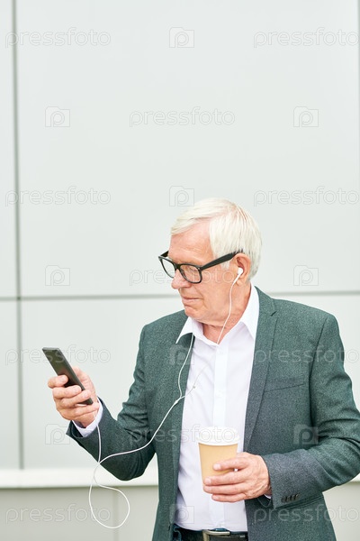 Старший бизнесмен с напитком, слушающий музыку