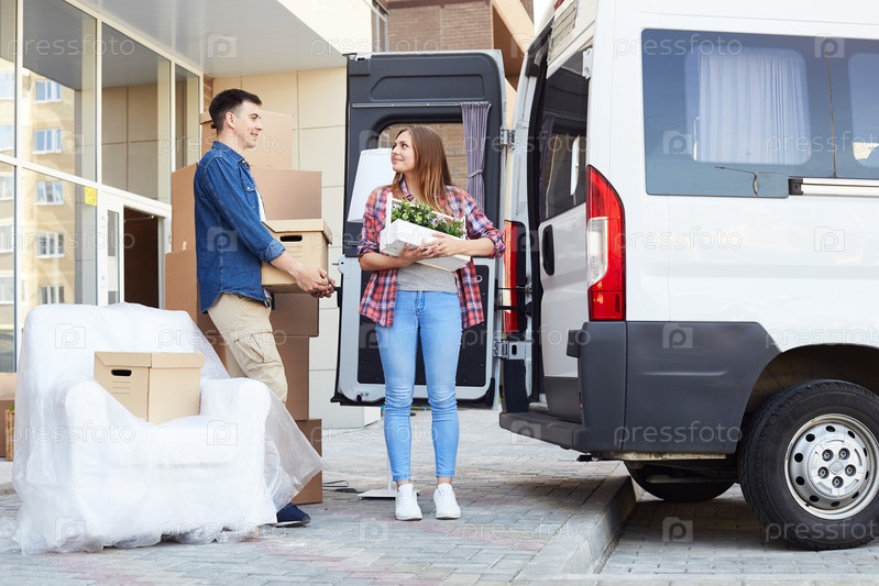 Счастливая молодая пара загружает передвигающийся фургон