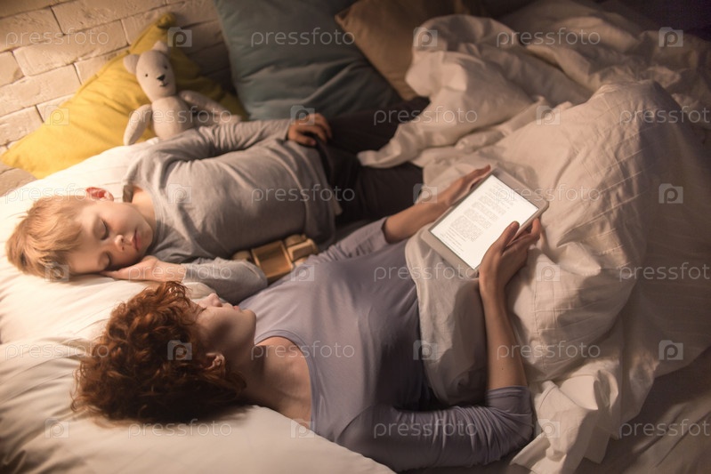 Мать засыпает в постели сына