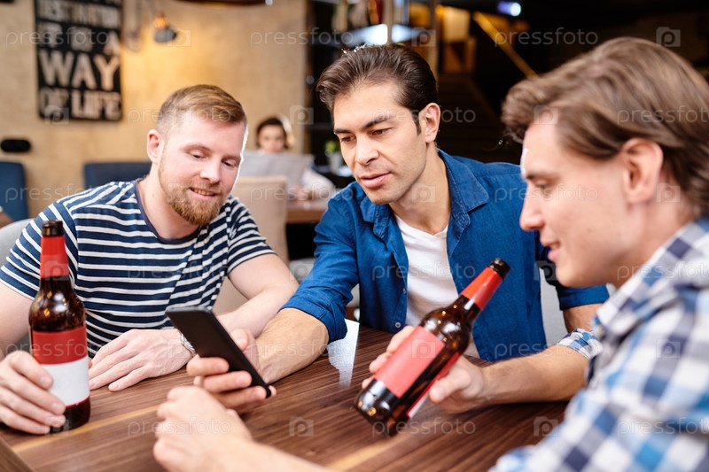Любопытные мужчины читают новости по телефону, выпивая пиво вместе